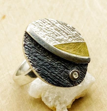 Sterling silver and 18 karat gold oval ring with diamond accent.