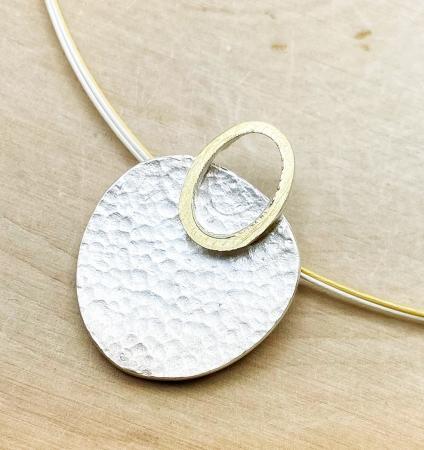 Sterling silver and 18 karat gold hammered finish necklace.