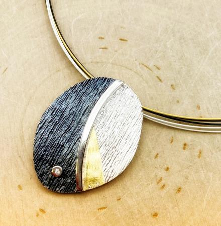 436-10762:Sterling silver and 18 karat gold oval textured necklace with diamond accent. IMG_9529.jpg Info Request: