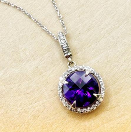 14 karat white gold checkerboard cut amethyst and diamond necklace.