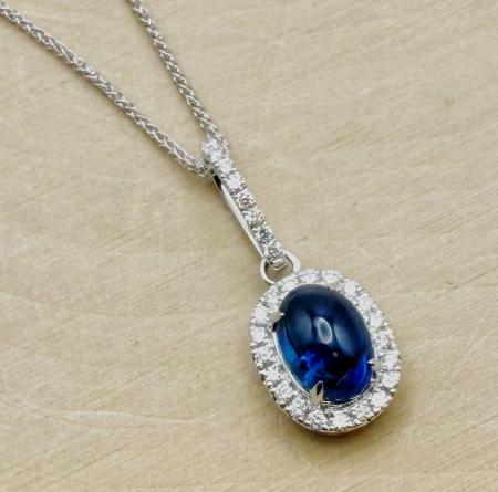 14 karat white gold cabochon blue sapphire and diamond necklace.