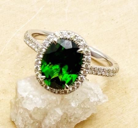 14 karat white gold chrome diopside and diamond ring.