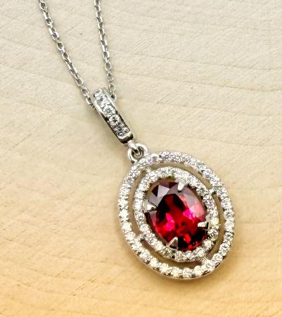 14 karat white gold vivid 0.99 carat oval ruby and diamond double halo necklace.
