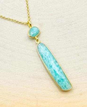 Sterling silver and 18 karat gold vermeil amazonite long drop necklace.