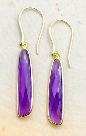 Sterling silver and 18 karat gold vermeil long drop amethyst earrings.