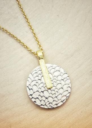 Sterling silver and 18 karat yellow gold vermeil textured circle necklace.